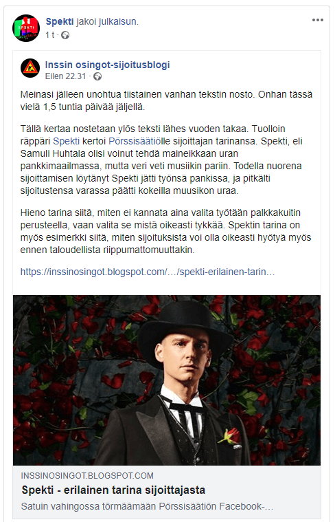 Keskiviikkoiltana koin mukavan yllätyksen sosiaalisen median puolella. Ihmettelin miksi blogiini tuli pieni kävijäpiikki ja blogin FB-sivuille tuli jokunen uusi tykkääjä sekä paljon peukaloita. Syypääksi tälle kaikelle paljastui räppäri Spekti, joka oli sattunut jakamaan tekstini omalla Facebook-sivullaan.