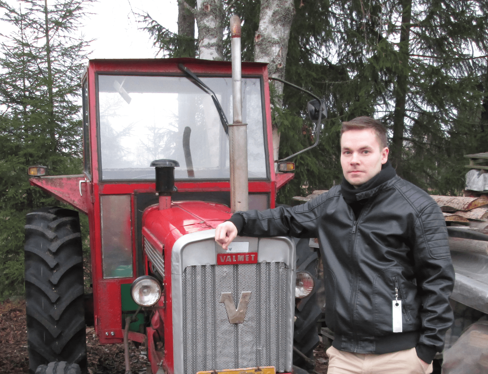 Meikäläisen piti vielä toimittaa jonkinlainen kuvituskuva itsestäni artikkelin jatkoksi. Heittäydyin hieman villiksi, ja päätin hakea jotain metsäistä teemaa kuviin. Eivätpähän luule meikäläistä aivan kaupunkilaiseksi. Lähetin Talouselämälle useampiakin vaihtoehtoja, ja he päätyivät lopulta kuvaan, jossa nojailen vanhaan Valmetin traktoriin.
